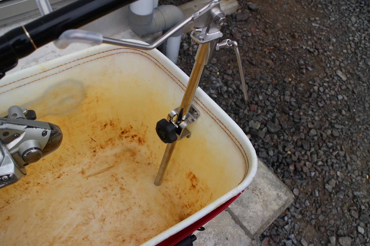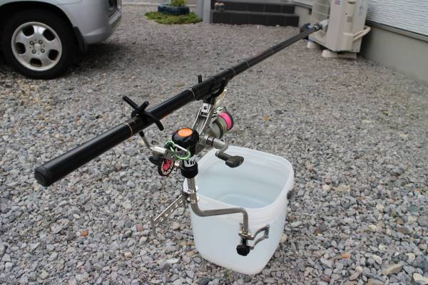 通常のライト竿受けでも両軸リールを付けた遠投磯竿を保持できます。